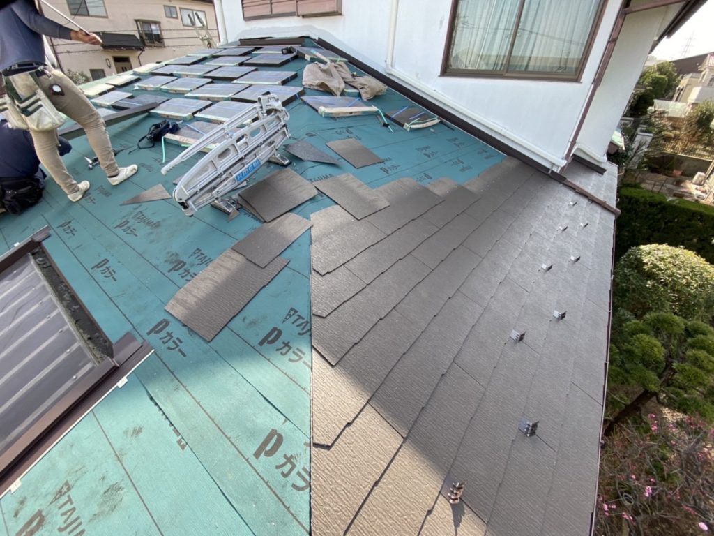 防水紙の上にコロニアルという材料を取り付けていく作業があります。屋根の形に合わせて、専用のカッターで綺麗にカットして、施工していきます。最終作業なので、必ず一枚一枚釘を打って取り付けています。